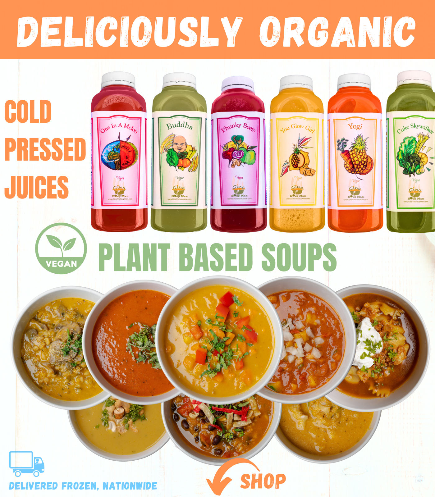 Our plant based Soups & Juices are made fresh daily at our award winning restaurant, Great Full Gardens, in Reno Nevada. We use only the highest quality natural ingredients. Always organic, vegan, dairy & gluten-free. No artificial, anything, ever. We ship frozen nationwide to ensure maximum nutritional value.